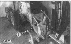 34. Put Tooling (B) under the radiator end of the rear frame. Remove the air supply from the parking brake release valve. Remove the fork lift truck. Note that Tooling (B) is under both sides of the radiator.