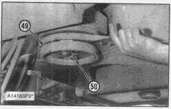 43. Measure the distance between plate (49) and the frame with a feeler gauge at each bolt hole. Remove bolts (50) and plate (49).