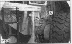 24. Remove all lines, wires and cables that were disconnected from the front and rear frames. Install the lock pin in the wheel lean bar and the front axle. Put blocks under the front wheels so they can not move. Install Tooling (A) under the platform on each side of the machine. Put a fork lift truck in position under the rear of the rear frame.