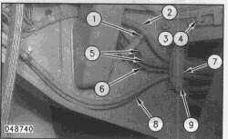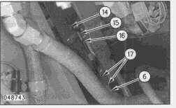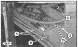 1. Remove bolt, washer and clip (1) that holds wiring harness (2), air lines (5), and clutch cable (6).