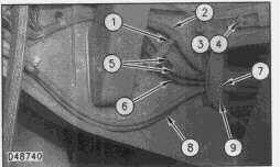 3. Remove bolt and washer (3) and bolt, washer and clip (9). Remove plate and two rubber grommets (7) holding ripper oil lines (8) and air lines (5), wiring harness (2) and clutch cable (6).