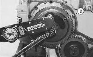 3. Use Tool (D) on the automatic timing advance and maintain a constant torque of 68 N·m (50 lb ft). Tighten the bolt that fastens the automatic timing advance to the fuel pump camshaft to a torque of 270 ± 25 N·m (200 ±18 lb ft).