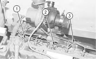 3. Tighten six fuel injection line nuts (2) at the fuel injection pumps to a torque of 40 ± 7 N·m (30 ± 5 lb ft).