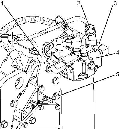 1. Disconnect harness assembly (1) . Use Tooling (A) in order to disconnect hose assembly (4) . Disconnect hose assemblies (3) and (5) and position aside. Remove tube assembly (2) .