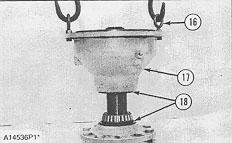 13. Remove housing (17) from the wheel spindle. The weight of housing (17) is 45 kg (100 lb).