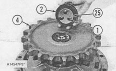 25. Put retainer (2) in position on the wheel spindle without shims (25). Install bolts (1). Tighten the bolts to a torque of 47 N·m (35 lb ft) while rotating the housing relative to the spindle. Without further rotation, remove the bolts and the retainer. Measure the distance between the end of the sprocket and the wheel spindle. Install the retainer and shims (25) that are the same thickness as the distance measured minus 0.25 to 0.38 mm (.010 to .015 in). If additional shims are required, use 9D-7047 Shims. Install bolts (1) that hold retainer (2) on the wheel spindle. Tighten the bolts to a torque of 260 ± 14 N·m (191 ± 10 lb ft). Install the wire on the bolts (1).