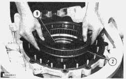 12. Put the seal rings on carrier (10) in the center of their grooves. Remove the two bolts from carrier (7). Softly push retainer (11) into position, and install the six bolts. Tighten the bolts to 36 ± 2 lb.ft. (5.0 ± 0.28 mkg).