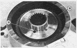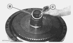 65. Put the three planet gears (59), six washers, six bearing assemblies, and three shafts in position in carrier. Install the bolts, locks, and retainers that hold the planet shafts (58) in place.