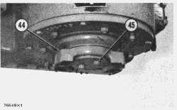 34. Remove the two bolts (45), shims, seal, and output flange (44) from the shaft. Put identification on the shims for use during assembly of transmission.