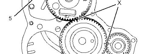 3. Carefully install camshaft assembly (8) into the cylinder block. Ensure that timing marks(X) are aligned on the following gears: