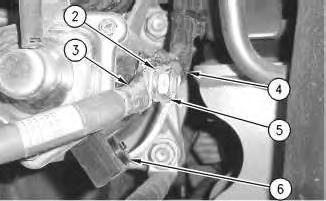 3. Install the screw and harnessassembly (6). Torque the screwto 3.6 ±1 N·m (32 ± 9 lb in). Install cable assembly (3). Install lock washer (2). Install harness assembly (4). Install nut (5). Torque nut (5) to 21 ±4 N·m (15 ± 3 lb ft).