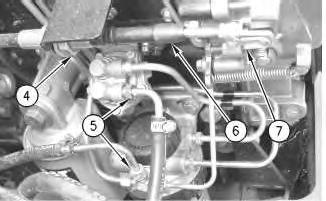9. Connect hose assemblies(5). Position governor cable (6). Install clip (7). Tighten nut (4) .