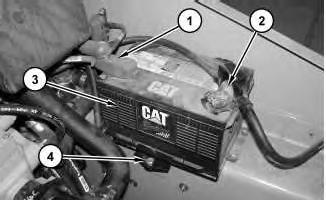 3. Remove bolt (4) and the clamp. Remove battery (3). The weight of the battery is approximately 18 kg (40 lb).