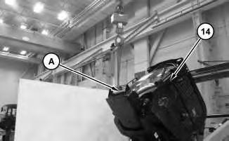 12. Attach Tooling (A) and a suitable lifting device to cab (14). The weight of cab (14) is approximately 290 kg (640 lb). Use Tooling (A) and the suitable lifting device to raise cab (14) enough to fully extend gas spring (17).