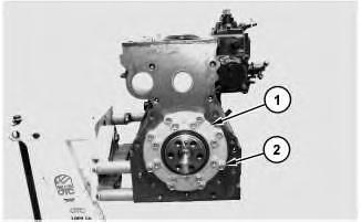 8. Position the gaskets and bearing case cover (1). Install bolts (2). Apply engine oil to threads and tighten bolts (2) to a torque of 24 to 27 N·m (18 to 20 lb ft).