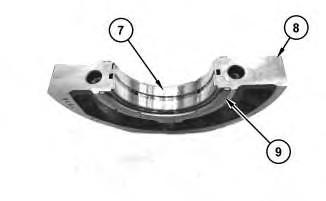 4. Put Tooling (C) on thrust bearing (9) and install a new thrust bearing for the rear main bearing only. Install the new thrust bearing (9) with the flat surface against the crankshaft main bearing case (10). Apply Tooling (C) to crankshaft main bearings (7). Install crankshaft main bearings (7) in the lower half of crankshaft main bearings case (8). Position crankshaft main bearings case (8) on the crankshaft.