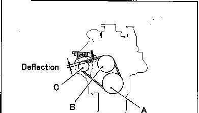 * Press each belt at a central portion between pulleys with a force of approximately 98 N {10 kgf} as shown in the illustration and measure the amount of deflection of the belt.