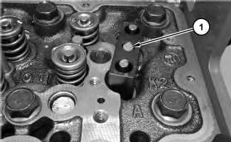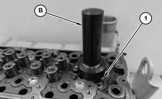 1. Use Tooling (B) and a hammer to install bridge dowel (1) . End By: Install valve springs of cylinder being repaired.