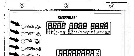 * The yellow fault alarm indicator FLASHES when the GSC detects a fault that is an alarm condition. The engine continues to run and start. The fault alarm indicator is accompanied by an alarm fault code that is shown on upper display when alarm codes key is pressed. Refer to SENR5809 for fault code descriptions.