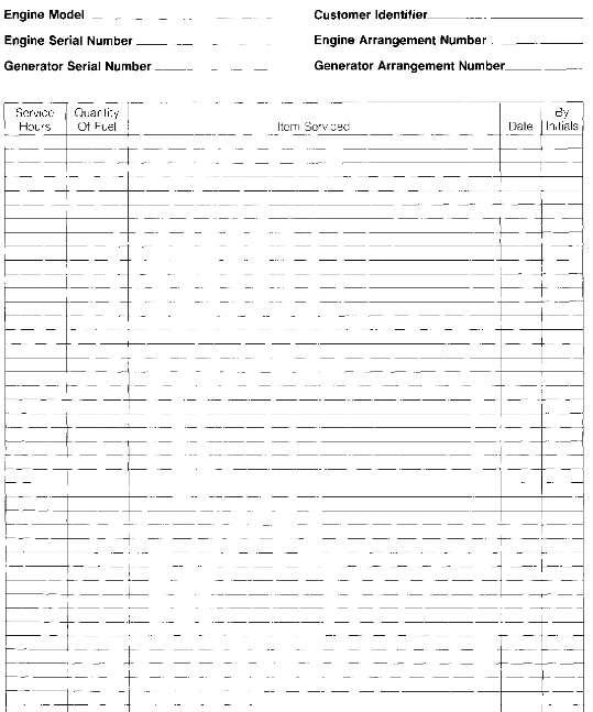 Thefollowingtypesofdocumentsshouldbekeptasproofofmaintenanceorrepairforwarrantyand shouldnotbedifficulttoobtainandkeepintheenginehistoryfile.Alldocumentsshouldshowdate, servicehours,gallonsoffuelconsumed,unitnumberandengineserialnumber.Iftheengineissold, transfertherecordswiththeengine.