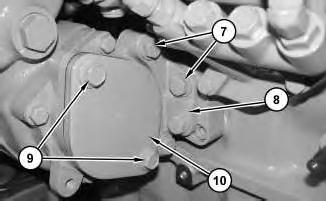 7. Remove bolts (9) and cover (10). Ensure that the timing mark on the crankshaft of the compressor is positioned between the timing marks on the housing for the compressor. Reinstall cover (10) and bolts (9). Remove bolts (7). Remove bracket (8).