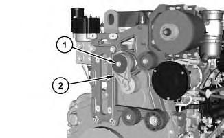 2. Remove bolt (1) and belt tensioner (2) .