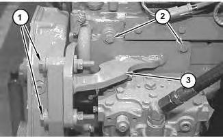2. Install support (3) on the front housing with three bolts (2) and the washers. Tighten the bolts to a torque of 55 ± 10 N·m (41 ± 7 lb ft).