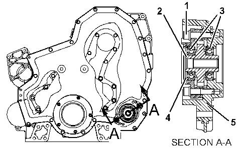 5. Install gear and shaft (2) with bearings (3) into accessory drive housing (5).