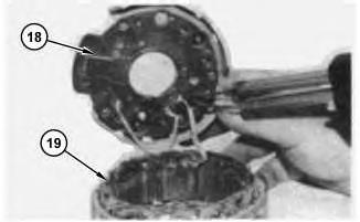 11. Unsolder the three stator leads and separate rectifier (18) from stator (19) .