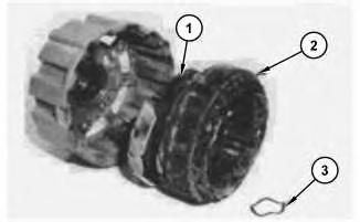 2. Position the insulators on the rectifier terminal studs. Position rectifier (1), and stator (2) into the rear frame, and install the three screws. Install the terminal insulators, washers, and nuts. Position wave washer (3) into the bearing bore of the rear frame.