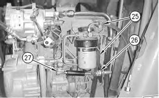 26. Connect two lines (25) and governor cable (27). Tighten nut (26) to 38 ± 2 N·m (28 ± 1.5 lb ft).