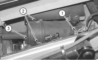 2. Loosen bolt (1), bolt (2), and bolt (3). Slide the alternator toward the engine and disconnect the alternator V-belts.