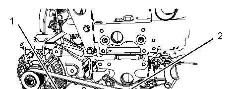 Ensurethatthebelttensionerissecurelyinstalled.Visuallyinspectthebelttensioner(1)for damage.Checkthatthepulleyonthetensionerrotatesfreelyandthatthebearingisnotloose. Someengineshaveanidlerpulley(2).Ensurethattheidlerpulleyissecurelyinstalled.Visually inspecttheidlerpulleyfordamage.Ensurethattheidlerpulleycanrotatefreelyandthatthe bearingisnotloose.Ifnecessary,replacedamagedcomponents.