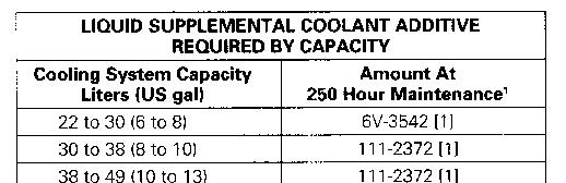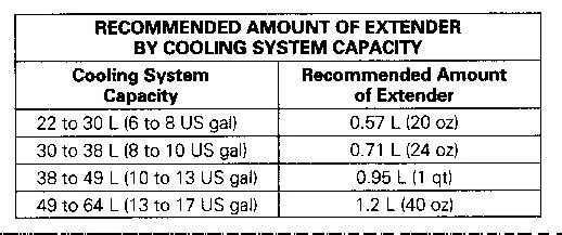 Extender should be added to the cooling system at the 3000 service hours or two years, whichever comes first. See the table to determine the recommended amount of Extender to add to Extended Life Coolant.