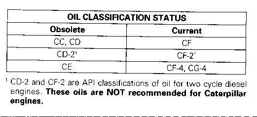 Diesel engine oil classifications CD, CD-2 and CE will not be API licensed categories after January 1, 1996. Caterpillar will only reference those categories that are licensed by the API. The table summarizes the status of the categories.
