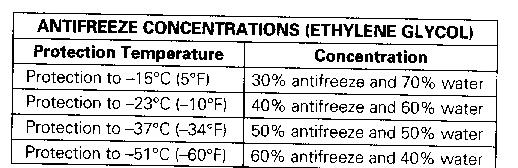 When filling or adding coolant to the system, premix the coolant solution prior to pouring it into the cooling system. Pure, undiluted glycol will freeze at -23°C (-10°F). Use a coolant solution that is in a range which will provide protection to the lowest expected outside (ambient) temperature and provide the required boil-over protection.
