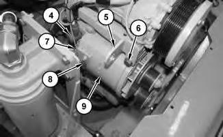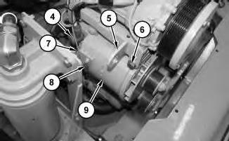 4. Disconnect harness assemblies (4), (7), and (8). Remove bolts (6), bracket (5), and alternator (9) .