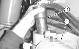 6. Strike the head of pin (15) with a suitable mallet. Continue to strike the pin and tighten the bolt until the torque is maintained.