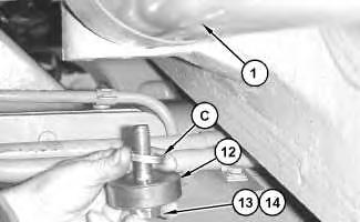 10. Place Tooling (C) on the top of washer (12). Install bolt (13), washer (14), washer (12) and Tooling (C) back into the pin at the head end of the steering cylinder.