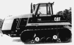 * Inspect for rocks or mud build-up between drive wheels (1) and idler wheels (2). Clean if excessive debris is present.