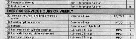 Performpreviousintervalitemsatmultiplesoftheoriginalrequirements.Forexample,atEVERY 100SERVICEHOURSOR2WEEKS,alsoperformthoseitemslistedunderEVERY50 SERVICEHOURSORWEEKLYandEVERY10SERVICEHOURSORDAILY.