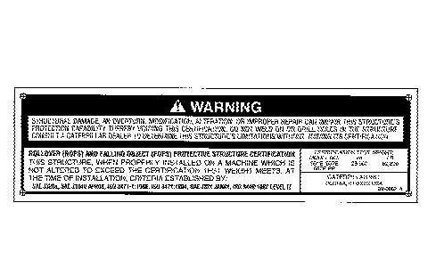 Structuraldamage,anoverturn,modification,alteration,orimproper repaircanimpairthisstructure'sprotectioncapabilitytherebyvoiding thiscertification.Donotweldonordrillholesinthestructure.Consult aCaterpillardealertodeterminethisstructure'slimitationswithout voidingitscertification.