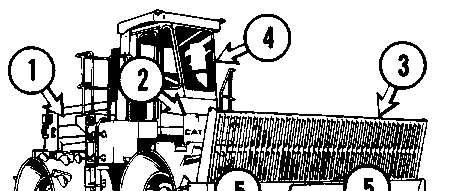 Engine(1),fueltank(2),bulldozerorlandfillblade(3),operator'scompartment(4),andcuttingedge andendbits(5).