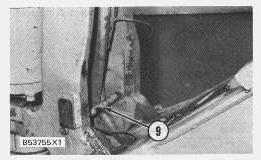 8. Fasten a nylon strap and hoist to boom cylinder rod (8) and put the rod eye in position on the swing frame and install pin (9).