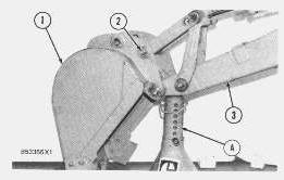 5. Remove pin (3) and remove the bucket and stick as an assembly away from boom (4). The weight is 415 kg (915 lb.).