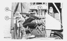9. Put marks of identification on the hydraulic hose connections at the control valve (9) and the location of hose assemblies in brackets (10) and (11).
