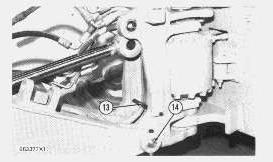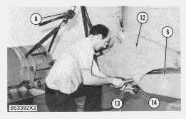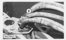 10. Put the hose assemblies in position in clamps (11), (12) and (13) according to previous identification. Do not tighten the bolts at this time.