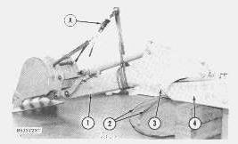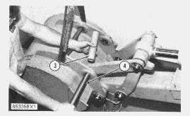4. Move the backhoe frame to the rear enough to give access to hose assemblies (3) and (4).