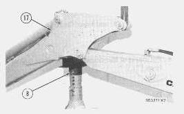 18. Fasten a nylon strap and hoist to stick frame (17). Lift the stick frame and boom and install tooling (B) at the junction of the stick frame and boom.