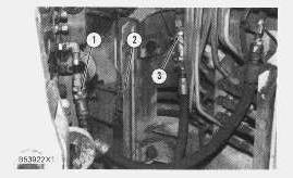 2. Put backhoe frame (2) in position to give access to hose assemblies (1) and (3).